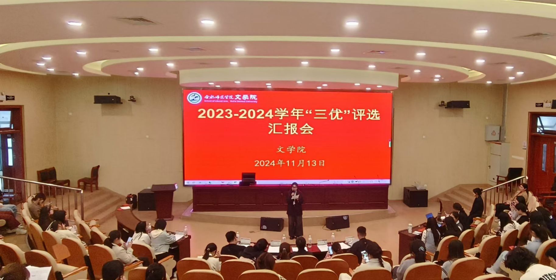 为进一步加强学风建设,营造“比学赶帮、相互促进、共同提高”的浓厚学习氛围,11月13日下午,beat365中文唯一官网在滨湖校区学术报告厅举办2023-2024学年“三优”创建评选汇报会,学院党委负责人、各年级辅导员,滨湖校区学生干部以及创建班级、宿舍汇报人参加汇报会。