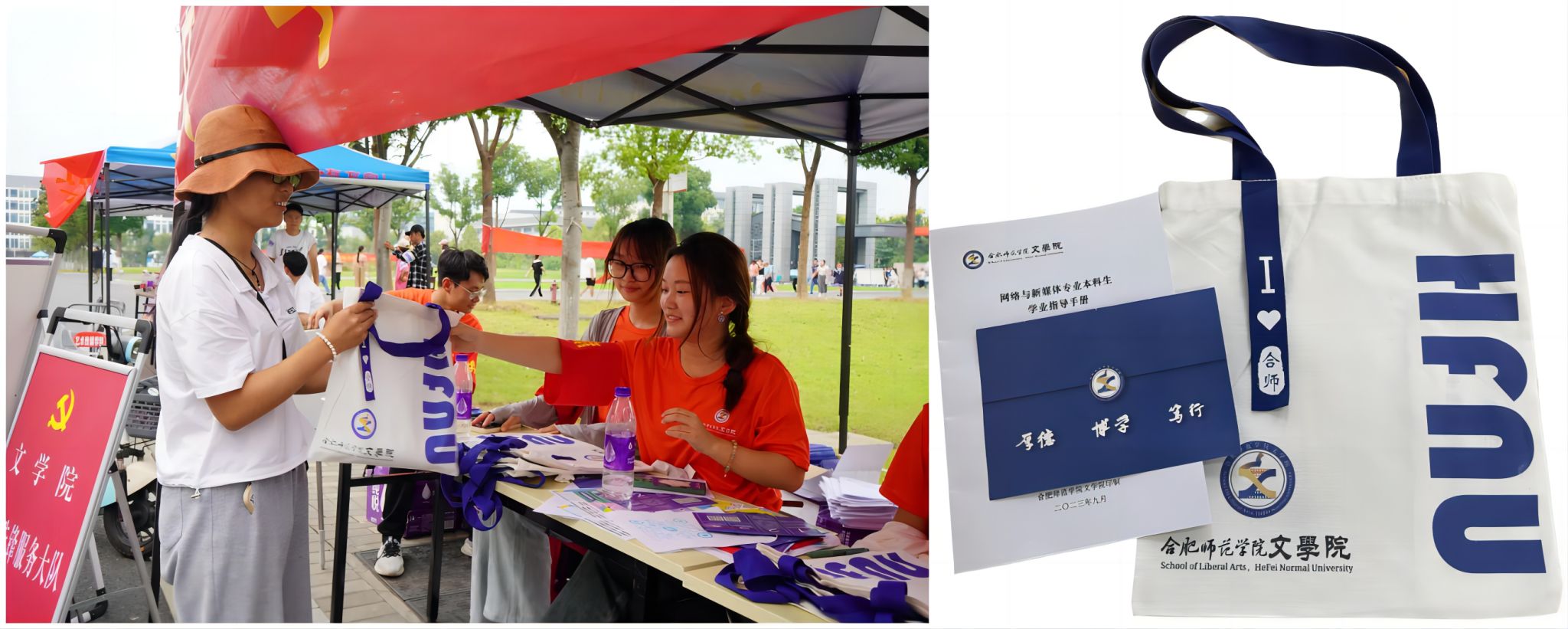 beat365中文唯一官网新媒体工作室设计的印有beat365中文唯一官网logo的文创帆布袋,成为学生、家长最受欢迎的“新生礼”,包中“学生指导手册”,让“成长”成为迎新的第一课。
