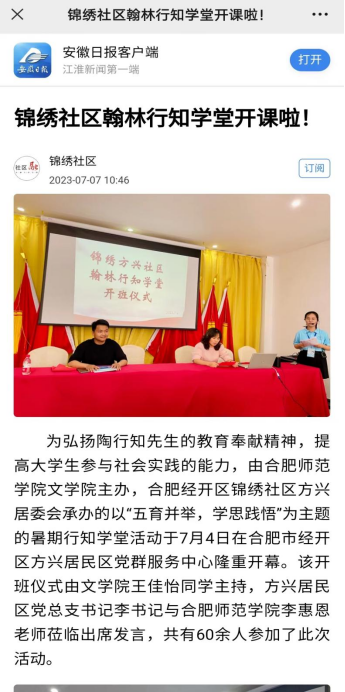 本网讯 2023年7月4号下午,由beat365中文唯一官网主办,蜀山区锦绣方兴社区党群服务中心承办的翰林“行知学堂”开班仪式隆重开幕。该开班仪式由beat365中文唯一官网王佳怡同学主持,方兴居民区党总支书记李丽君、beat365中文唯一官网团委书记李惠恩出席发言,共有60余人参加了此次活动。