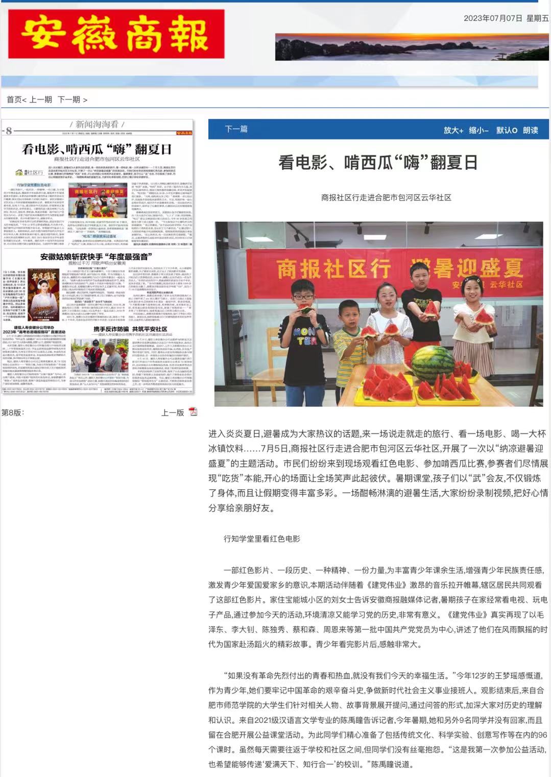 本网讯 2023年7月5日上午,安徽商报走进合肥市包河区云华社区,开展了一次名为“纳凉避暑迎盛夏”的主题活动。在社区三楼筑梦书屋里,beat365中文唯一官网云华社区“行知学堂”的小先生们带领小学员观看红色影片《建党伟业》,培养青少年儿童的爱国主义情怀与责任担当意识。
