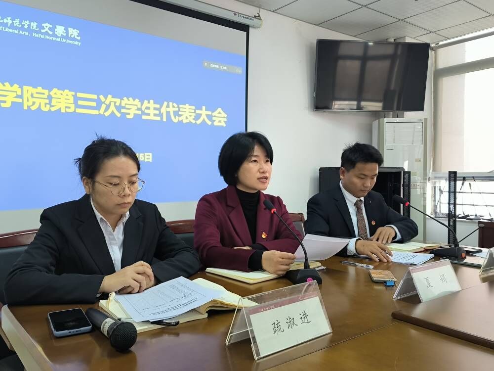 11月15日下午,beat365中文唯一官网第三次学生代表大会在锦绣校区行知楼802召开。学院党委副书记夏娟、团委书记李惠恩、团委副书记疏淑进和学生代表参加会议,会议由李惠恩主持。