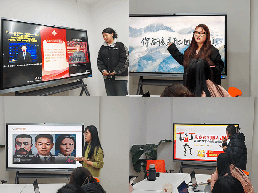 主动回应时代关切,有成员通过《为什么学习思政:青年使命与担当》《凝聚青春正能量 同心共筑中国梦》等主题阐释新时代背景下,青年的行动与担当;结合青年大学生的成长成才与全面发展,有成员通过《你应该是自己的那座山——正确人生观引导下的自我探索》《大学生学习态度与成长感悟》《红色文化的“出圈”密码:新媒体时代的年轻化表达》等主题,尝试描绘新时代奋进路上,青年一代实干担当的生动画卷;透过青年关切视角,从青年群体喜闻乐见的话题出发,有成员通过《哪吒之魔童闹海——解锁中国文化自信的超强密码》《从春晚机器人扭秧歌看科技与艺术的融合创新》《逃出大英博物馆——文物剧本杀折射的青年观照》《奋斗驱萧索 不负少年时——从世界局势视角看青年启迪》等主题,尝试镌刻青年一代洞察未来的见解与直面挑战的勇气,置身于时代浪潮,以行动启迪智慧。