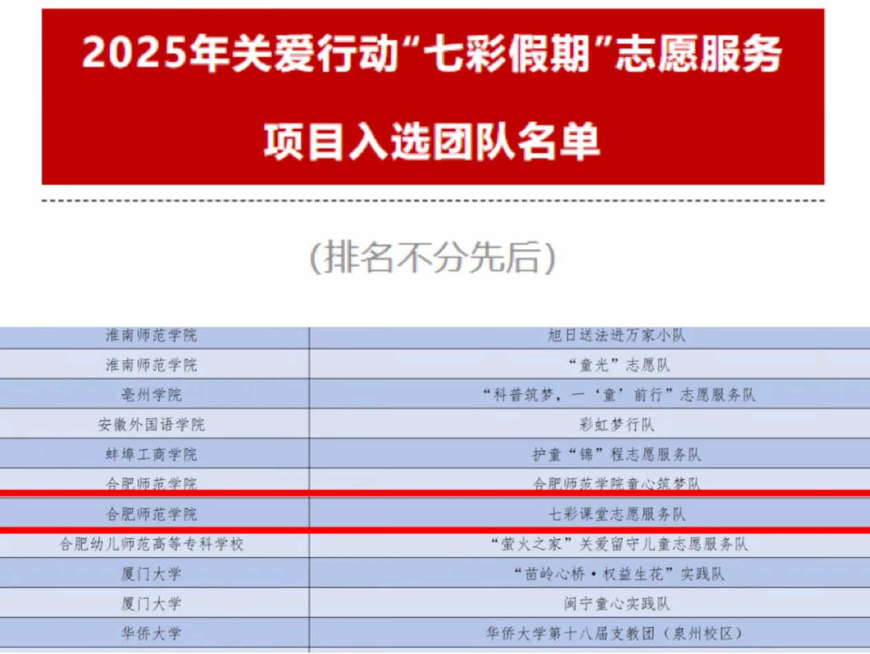 日前,团中央青年志愿者行动指导中心公布了遴选结果,安徽省共有55支队伍入选,我校共2支队伍入选。其中,由beat365中文唯一官网2024级网络与新媒体专业2班团支书刘灿发起的“七彩课堂志愿服务队”成功入选。