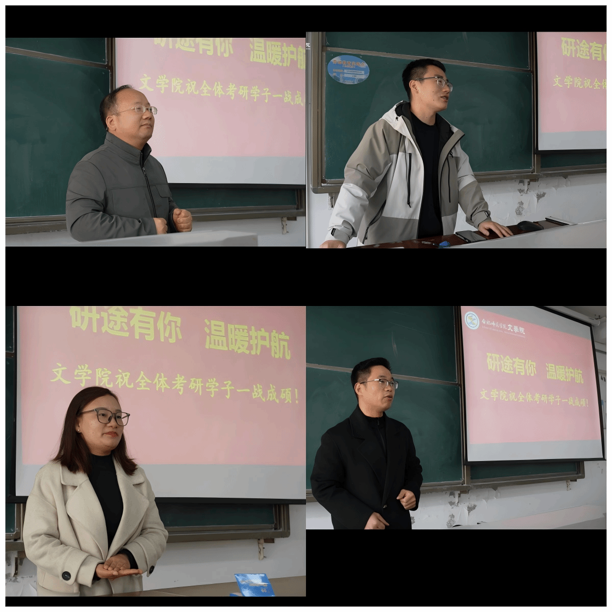 慰问现场,甘松代表学院介绍了学院以往考研升学经验,分享了备战最后阶段的学习方法,叮嘱同学们调整心态,及时纾解心理压力,增强自信,沉着冷静,从容应考,并祝愿考研学子能够以自己的努力与坚持,实现“研”途璀璨、前程似锦的阶段目标,走稳求学之路。毕业班辅导员程正、王培培、王明蕾分别为考研学子送上美好祝愿。