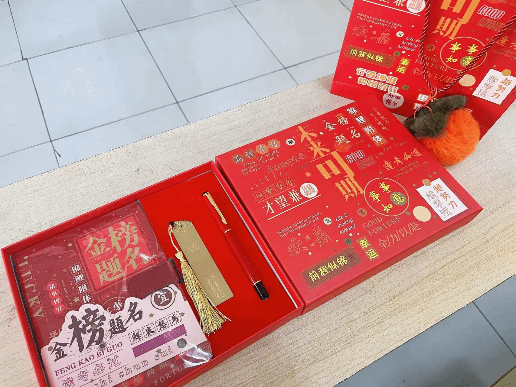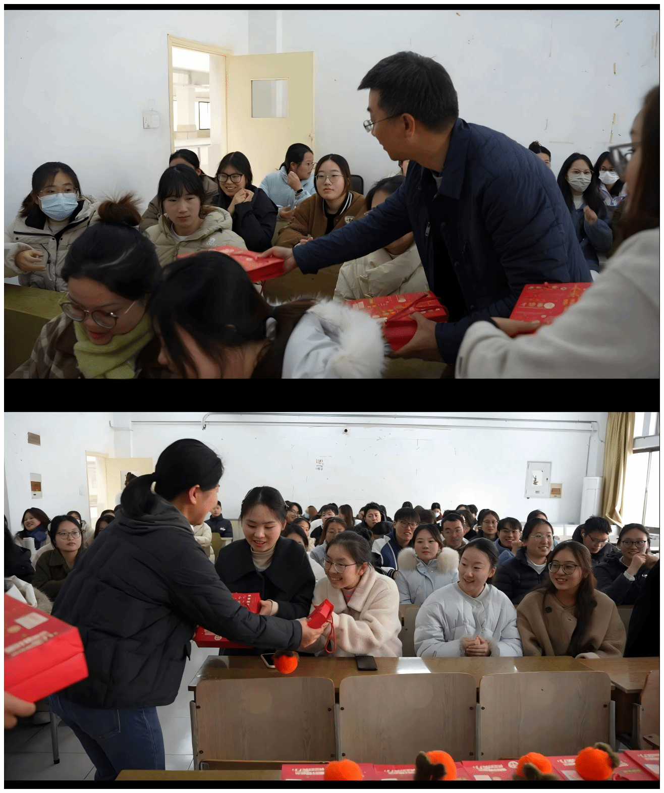 许锃、夏娟、甘松为考研学子送出考研福袋、礼包,叮嘱他们调整心态、积极应考。福袋以鲜艳的红色为主基调,包含笔记本、书签、钢笔、挂饰等文创产品,“金榜题名”“前程似锦”“锦鲤附体”“柿柿如意”等富有寓意的词语点缀其上,承载着对考研学子的殷殷祝愿,更暗合同学们求学路上对青春筑梦的未来期许。