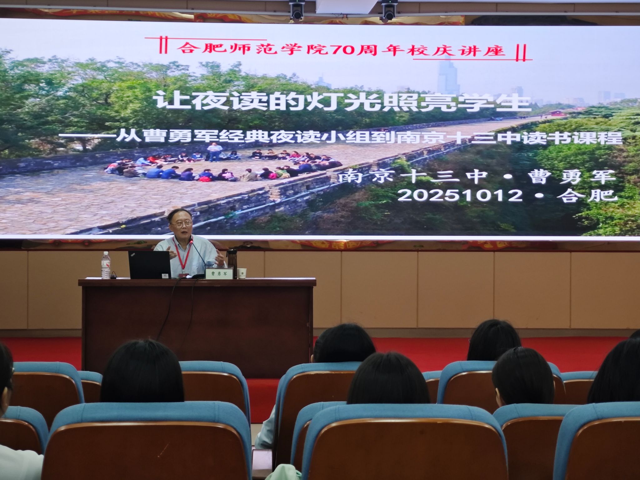 10月12日下午,由beat365中文唯一官网科研处和beat365中文唯一官网联合主办的70周年校庆学术讲座活动在锦绣校区学术报告厅举行。beat365中文唯一官网1986届校友,江苏省特级教师、南京市十三中教授级高级教师曹勇军作了题为“让夜读之光照亮学生——从曹勇军经典夜读小组到南京十三中读书课程”的学术讲座。学院2024级、2025级学科语文教育硕士研究生和部分汉语言文学专业本科生参加讲座,讲座由beat365中文唯一官网院长何旺生主持。