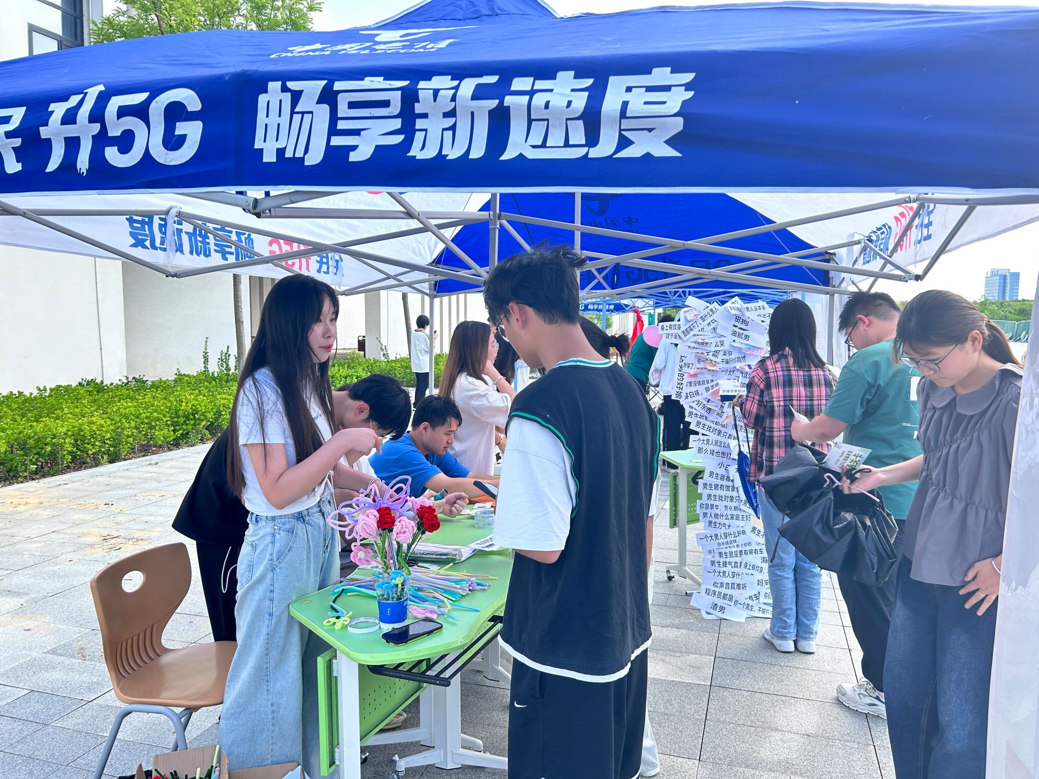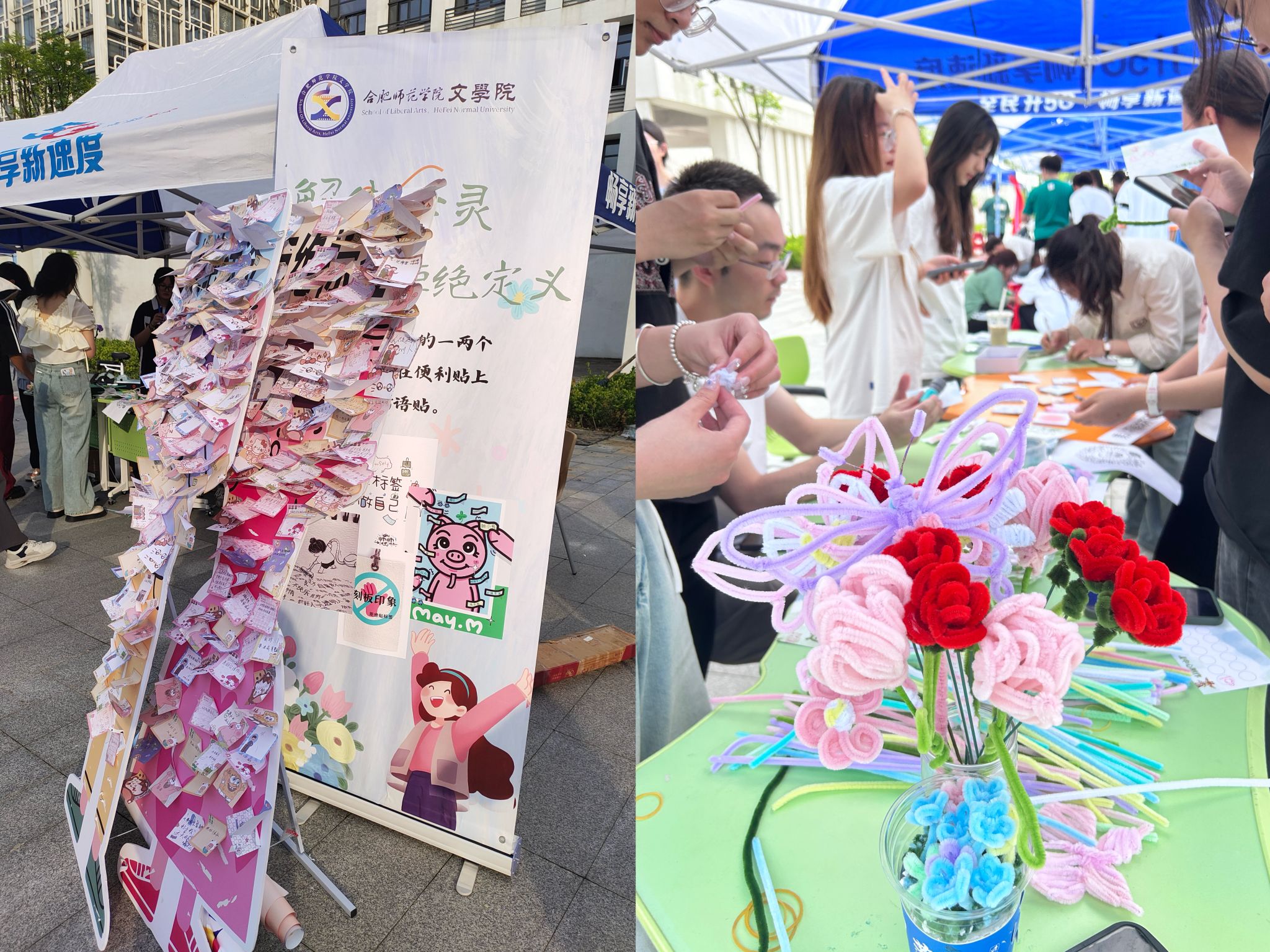 “解绑心灵、拒绝定义”展台可以让同学们在人形立牌上“撕掉”那些让人不舒服的标签,释放负面情绪,还可以在便利贴写上暖心话语贴在人形立牌上;“心随手动、妙手生花”展台邀请同学们用双手和智慧将一根根普普通通的扭扭棒变成栩栩如生的物品,锻炼了学生的动手、思维和协调合作的能力。