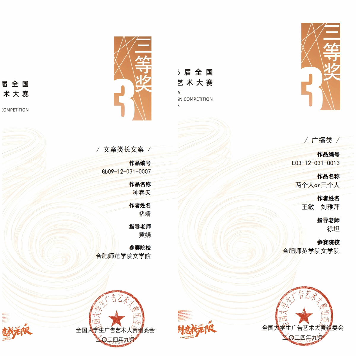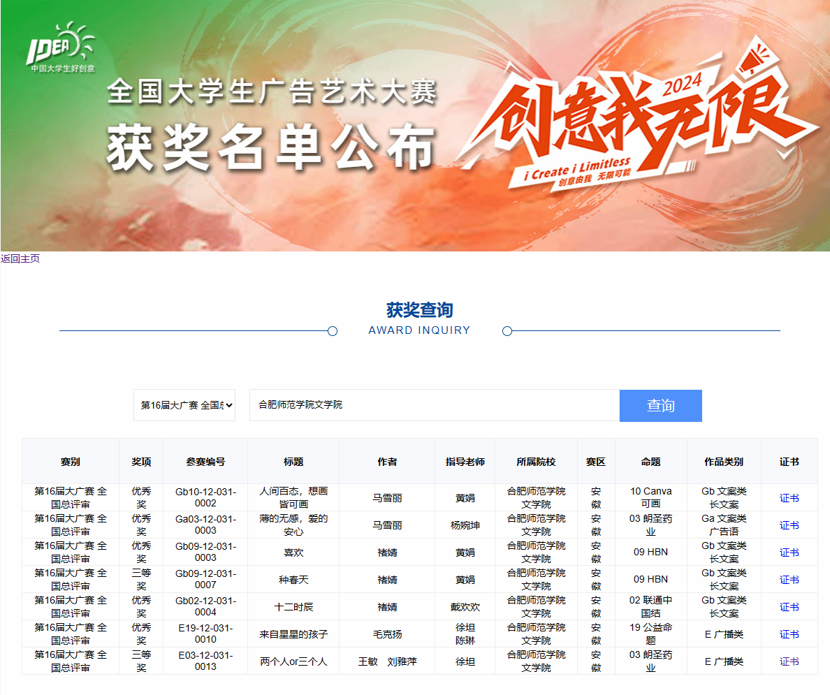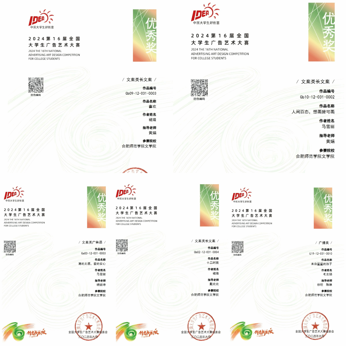 近日,第十六届全国大学生广告艺术大赛(简称“大广赛”)全国总评审结果正式公布。经过激烈角逐,beat365中文唯一官网师生再创佳绩,共获得7项国家级奖项、35项省级奖项,其中国家级三等奖2项,国家级优秀奖5项,安徽赛区一等奖13项、二等奖10项、三等奖12项,beat365中文唯一官网在全国赛区及安徽赛区获奖数量,创近年来参赛成绩新高。