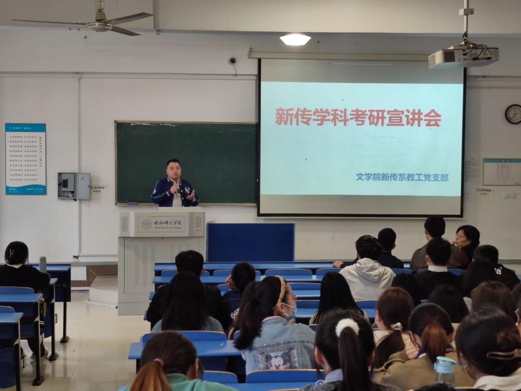 张阿源分别从考研概述、硕士学位与新传学科专业介绍、考试科目及录取分数线、新传学说的硕士点高校分布情况、院校选择方法及技巧、考试科目的复习方法以及本系历年考研录取情况等方面情况展开宣讲。他指出,对于院校的选择及之后的就业去向是关键点,以自身经历着重强调考研的意义,鼓励同学们立志高远、脚踏实地、精心准备,努力拼搏。