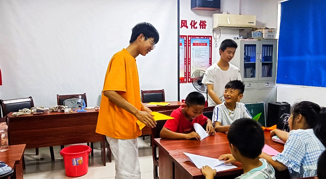 欢乐折纸由安徽信息工程学院学生汪志斌讲授。首先,他带领学员们开展了小小的暖场活动——折纸飞机,并比赛谁的纸飞机飞得更远。之后,他发下彩纸,教授小学员们如何折千纸鹤和五角星。随后,他增大难度,耐心地讲授并操作如何折树叶信封。最后,他将提前折好的纸玫瑰分发给大家,与孩子们相处的不亦乐乎。