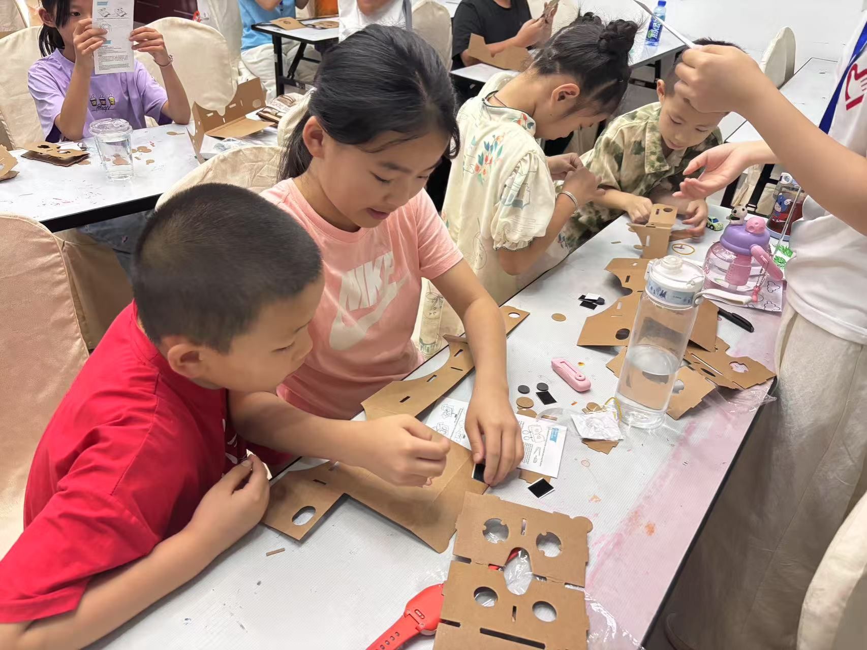 教室里很快响起了细碎的讨论声,有的孩子对着说明书皱眉思索,有的则尝试着将纸板按折痕塑形。“小先生”们穿梭在课桌之间,随时为遇到困难的孩子提供指导。起初,复杂的组装步骤让不少孩子犯了难,连几位“小先生”也在调试角度时频频碰壁。就在这时,“小先生”姬心萍与两名小学员率先完成了制作。令人动容的是,他们没有立刻体验成果,而是主动起身,分头走到其他小组旁:“需要帮忙吗?这个卡扣应该这样扣才对。”“魔术贴要贴在这个位置才稳固。”